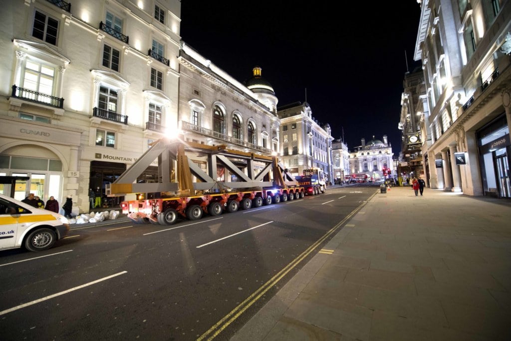 Deliveries of the trusses from Colnbrook into London commenced on a Wednesday evening. On each occasion the 21:00 hours delivery was unloaded on arrival with the empty vehicle departing site before 23:00 hours. The 23:00 hours delivery would then arrive and wait on a closed off section of Orange Street until 18:00 hours the following evening when unloading would take place. The empty vehicle would then leave the construction site after 19:00 hours so as to comply with Metropolitan Police restrictions within Central London. This process continued for three consecutive nights, with the loads on the Friday being delivered and unloaded on the same night to avoid any Saturday unloading and conflict with the upcoming Chinese New Year Celebrations. All empty vehicles had to be routed, notified and escorted out of the capital, utilising the pre-arrange use of the dedicated Transport for London Bus Lane to gain access from the bottom of Haymarket to Trafalgar Square before continuing via Whitehall, Parliament Square, Victoria, Hyde Park Corner and the A4 Westbound out of London.