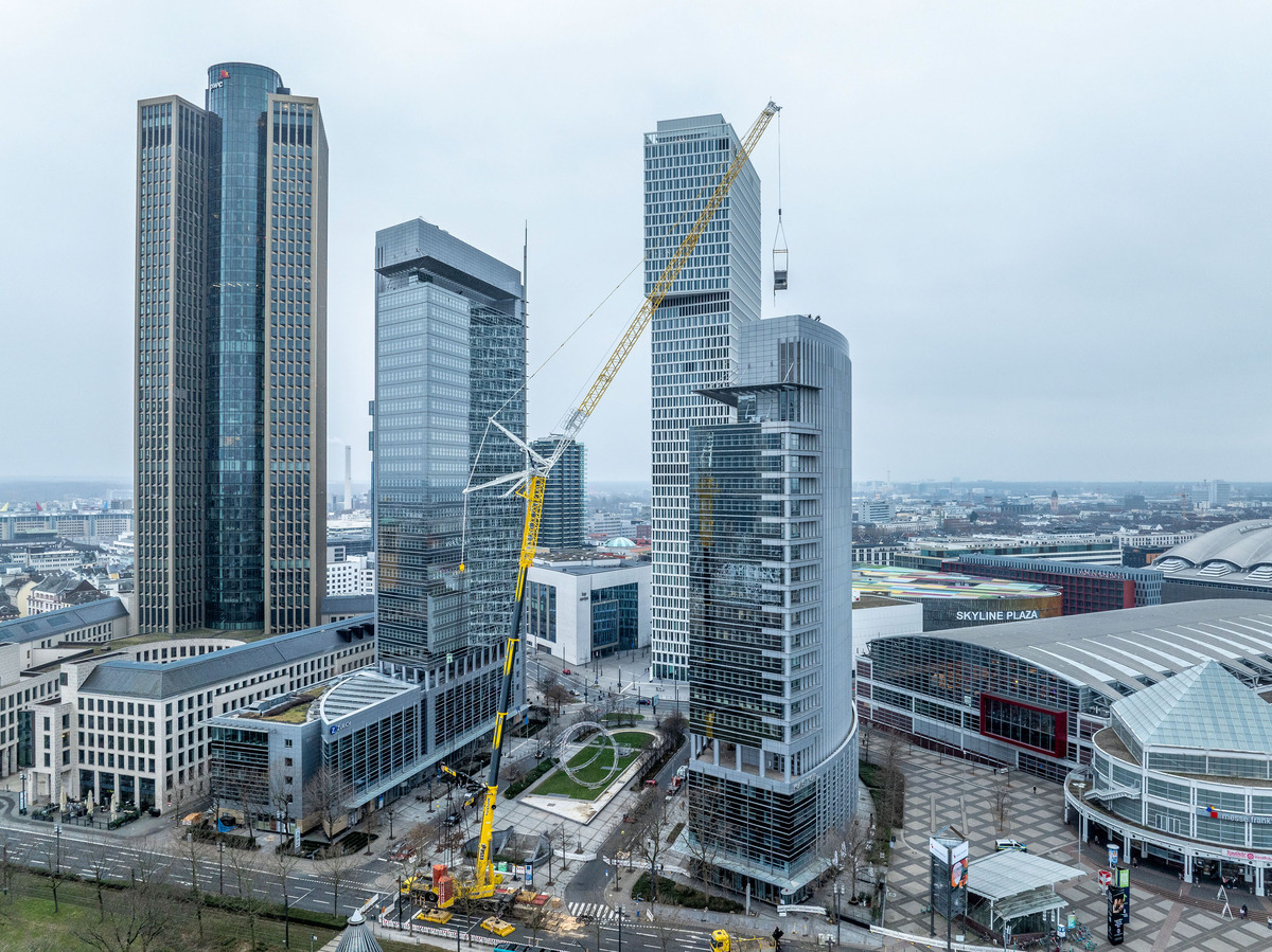Kastor and Pollux are twin towers in Frankfurt am Main. They bear the names of an inseparable pair of brothers from Greek mythology. The two towers form the “Forum” high-rise complex on the Platz der Einheit and are part of the Frankfurt skyline. In mid-January, a crane boom with a length of over 120 metres was added to the silhouette – an LTM 1650-8.1 from crane and heavy haulage contractor Eisele AG replaced chiller units on Kastor. Assembly and removal of the eight-axle crane, as well as all the lifting work, had to be completed over one weekend.