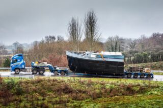 An interesting heavy haulage move took place last year in Northern Ireland, in which Mar-Train Heavy Haulage moved a dredging barge from the docks at Londonderry to Lough Neagh, the largest freshwater lake in Ireland and the British Isles, which covers an area of 151 square miles. Lough Neagh is a source of high quality sand, which the Norman Emerson Group has been extracting for generations for use in a wide range of building materials. When its old barge was due for replacement, a new one was sourced from Holland. This new barge is much larger and more efficient than the old one. But its size resulted in a number of challenges in terms of getting it from the docks to the lake, some 65 miles away. Lisburn-based Mar-Train – which had assisted with the move of the group’s last barge back in 2003 when it was brought in complete by Heanor Haulage – was tasked with the job, which initially entailed moving it around two miles from the dock to a holding area.