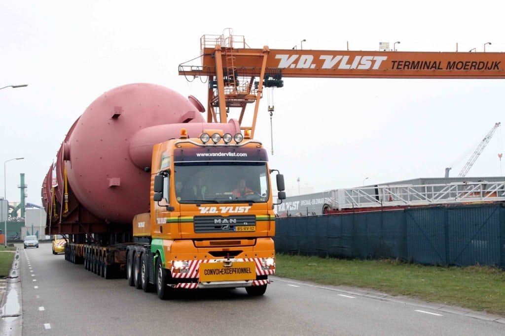 Following the incident VSE (Verolme Special Equipment), neighbours of Van der Vlist’s Moerdijk terminal, received the order to build and deliver a new 100 ton pressure drum at (L) 34.8m x (W) 5.40m x (H) 5.70m. They asked Van der Vlist to arrange the transport from their yard to the coating facility and then onwards to Shell’s Moerdijk site.